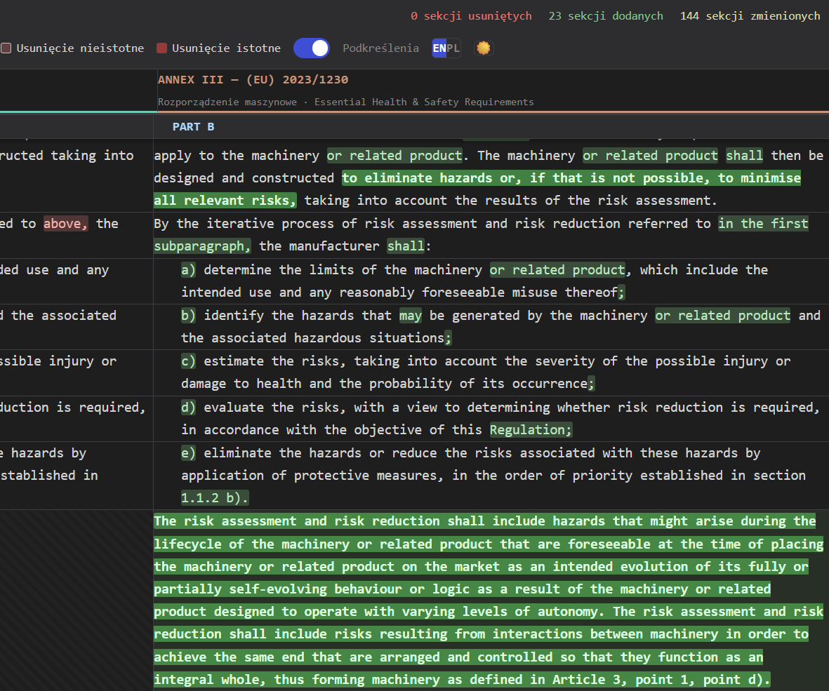 Narzędzie służy do porównania wymagań zasadniczych między dyrektywą maszynową 2006/42/WE, a wchodzącym w życie w 2027 roku rozporządzeniem maszynowym 2023/1230. Narzędzie jest w wersji beta (testy powszechnego użytku z chorobami wieku dziecięcego). Program jest na dzień wydania otwarto źródłowy, udostępniany bezpłatnie na licencji GNU GPL v3. Jeżeli użyjesz lub zmodyfikujesz to oprogramowanie, to to co stworzyłeś musi być udostępniane również na licencji GPL. Porównywarka wymagań zasadniczych